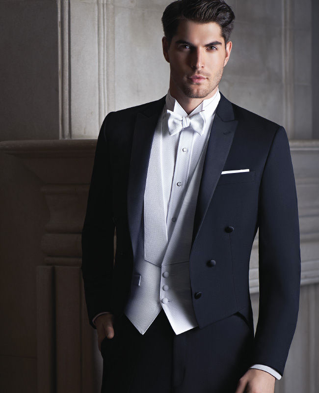 White Tie, also known as full-dress, is as formal as you can go. This formality code is usually reserved for extremely formal ceremonies, royal weddings, and diplomatic galas. It consists of a black tails coat (short front with tails in the back) with black tuxedo pants worn with a white pique shirt, a white pique waistcoat (a waistcoat is a vest with lapels to mimic a coat) and a white pique bowtie. Patent leather shoes will complete the outfit but if you wish, a top hat, white scarf and white gloves will do perfect.
